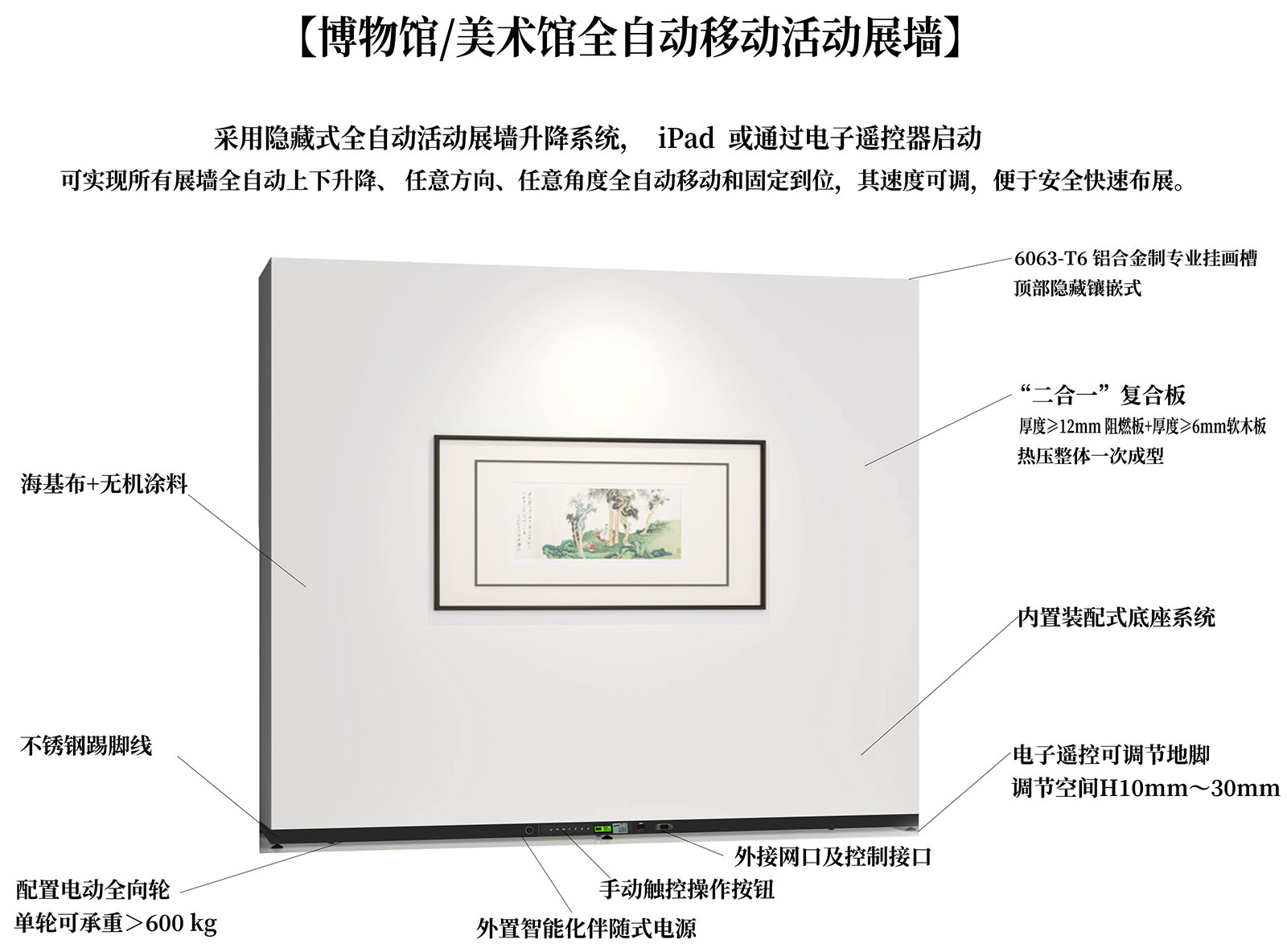 配置电动全向轮,单轮可承重>600kg,隐藏式设计,配带H600MM踢脚线,内置装配式底座系统,电子遥控可调节地脚,调节空间H10MM—30MM